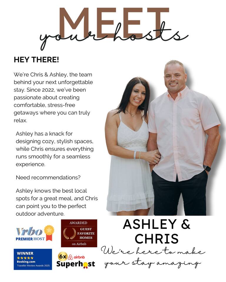 Hi there! We’re Ashley and Chris, the husband-and-wife team behind Stoney Creek Stays. We fell in love with hosting through our own travel experiences and have turned that passion into a mission: helping guests create unforgettable memories in beautiful homes that feel like their own.