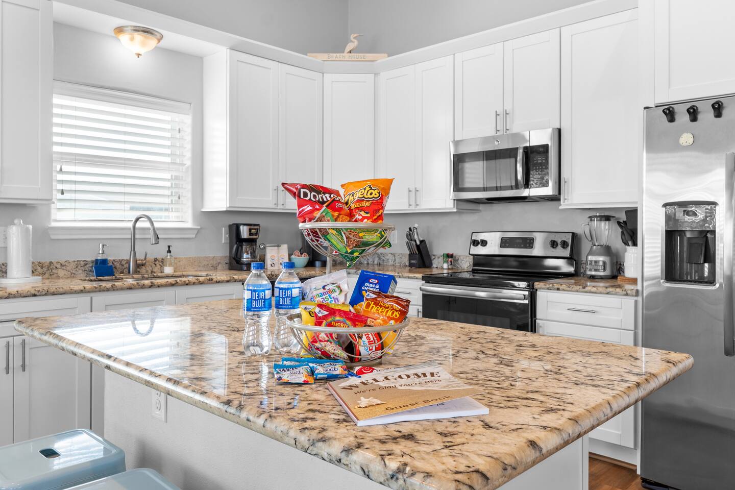 We include a starter supply of toilet paper, paper towels, trash bags, dishwasher pods, laundry pods, coffee, and filters to help you settle in.