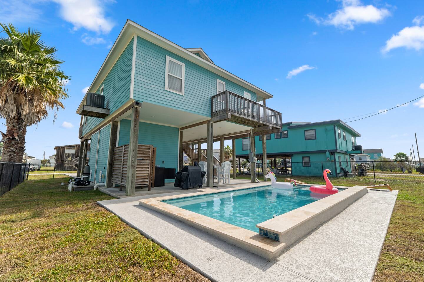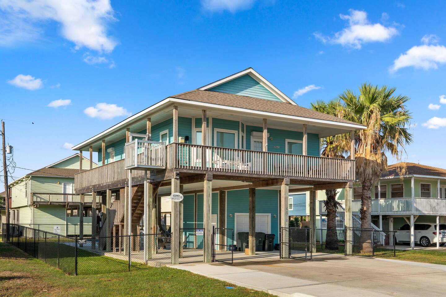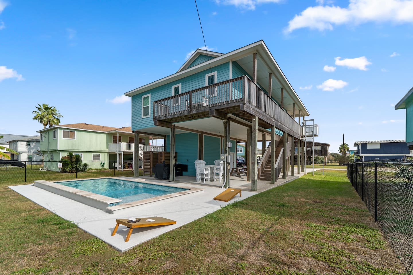 At Last!! is an elevated coastal home in Galveston’s peaceful Sea Isle neighborhood. Designed for comfort and easy beach living, it offers indoor-outdoor space, a private pool, and room for families or groups to spread out.