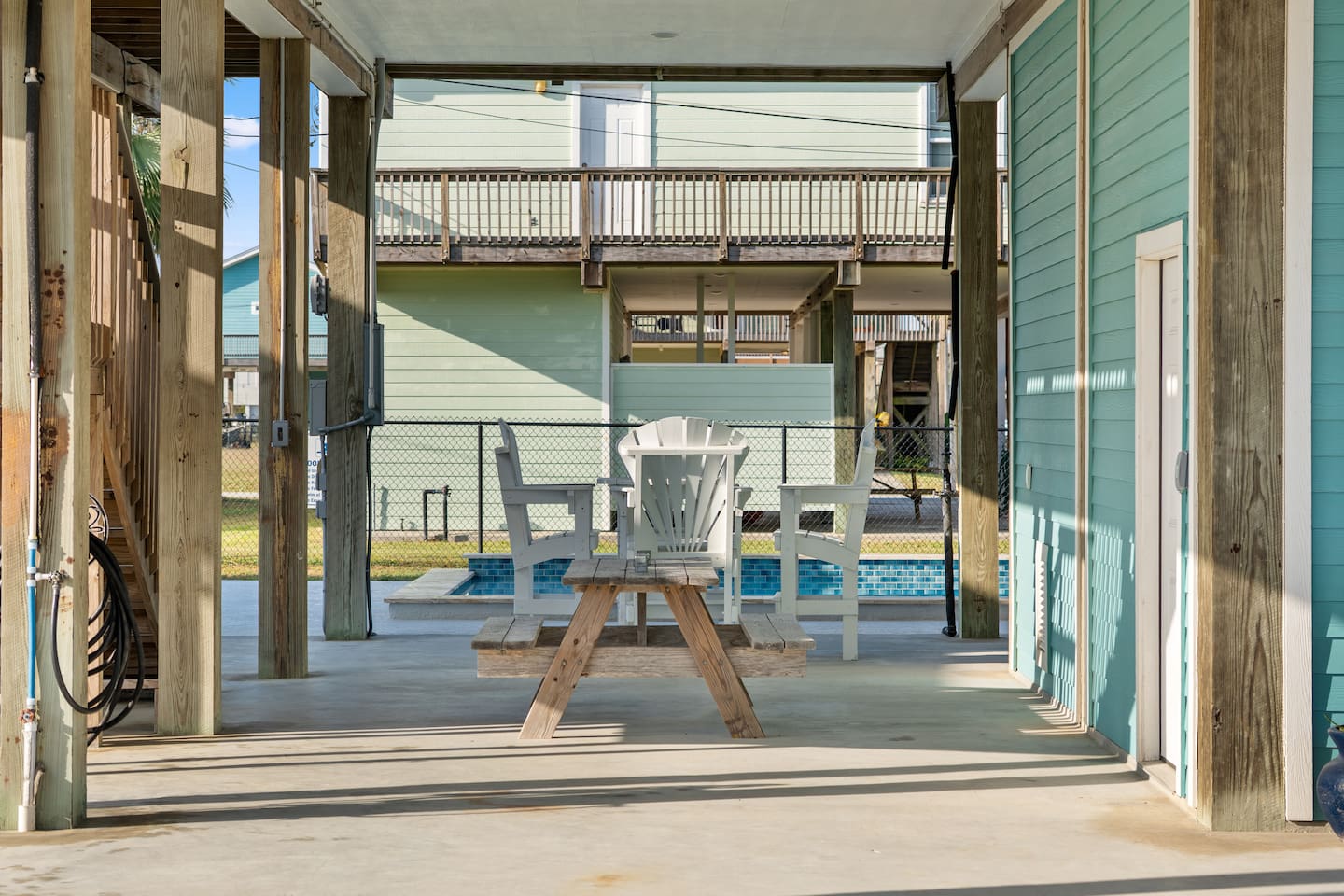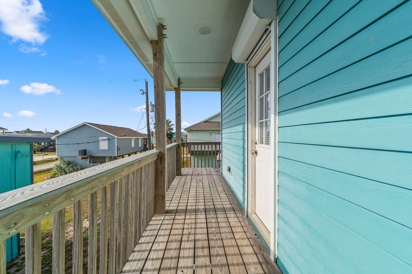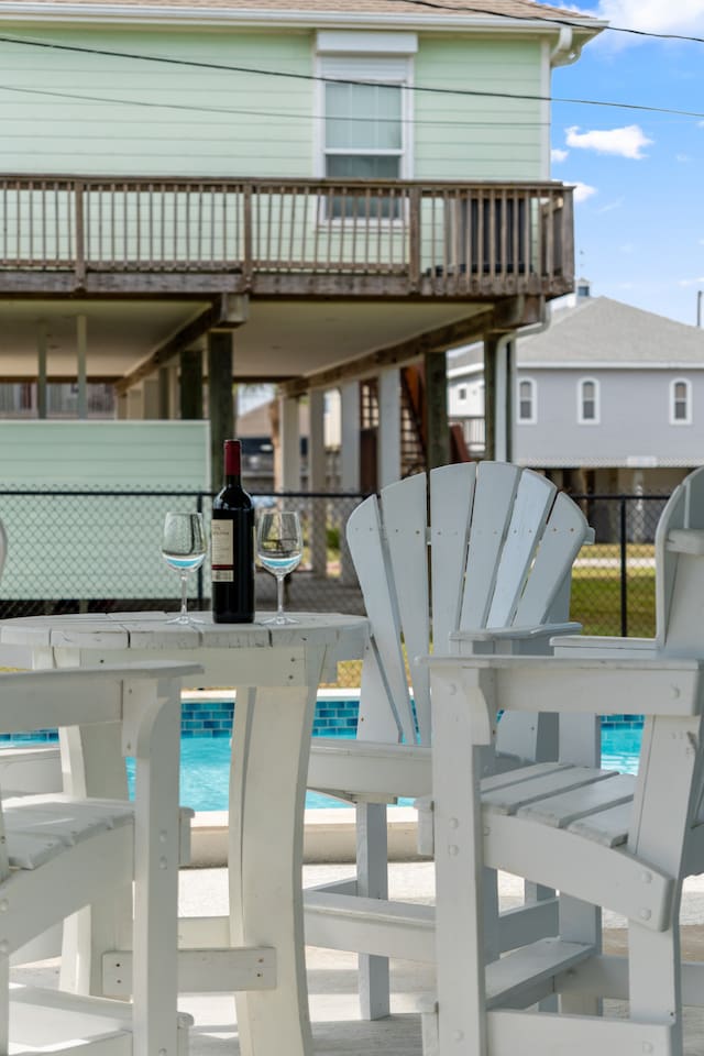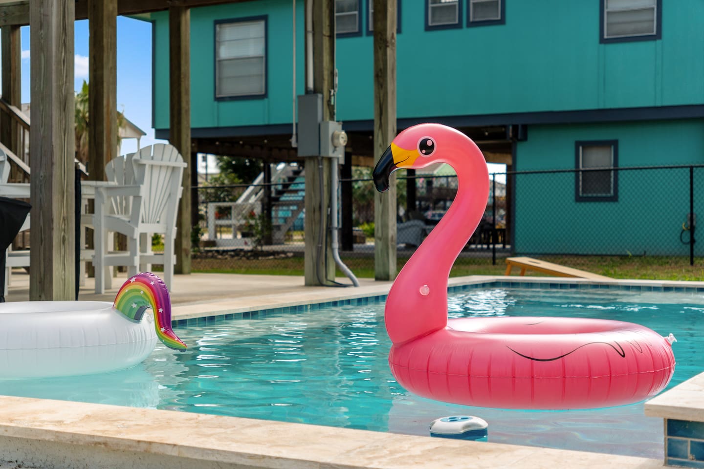 At Last!! is an elevated coastal home in Galveston’s peaceful Sea Isle neighborhood. Designed for comfort and easy beach living, it offers indoor-outdoor space, a private pool, and room for families or groups to spread out.
