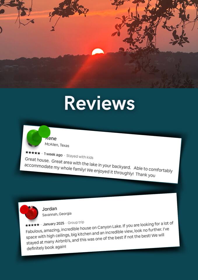 Jordan: "Fabulous, amazing, incredible house on Canyon Lake. If you are looking for a lot of space with high ceilings, big kitchen and an incredible view, look no further. I've stayed at many Airbnb's, and this was one of the best if not the best! We will definitely book again!"